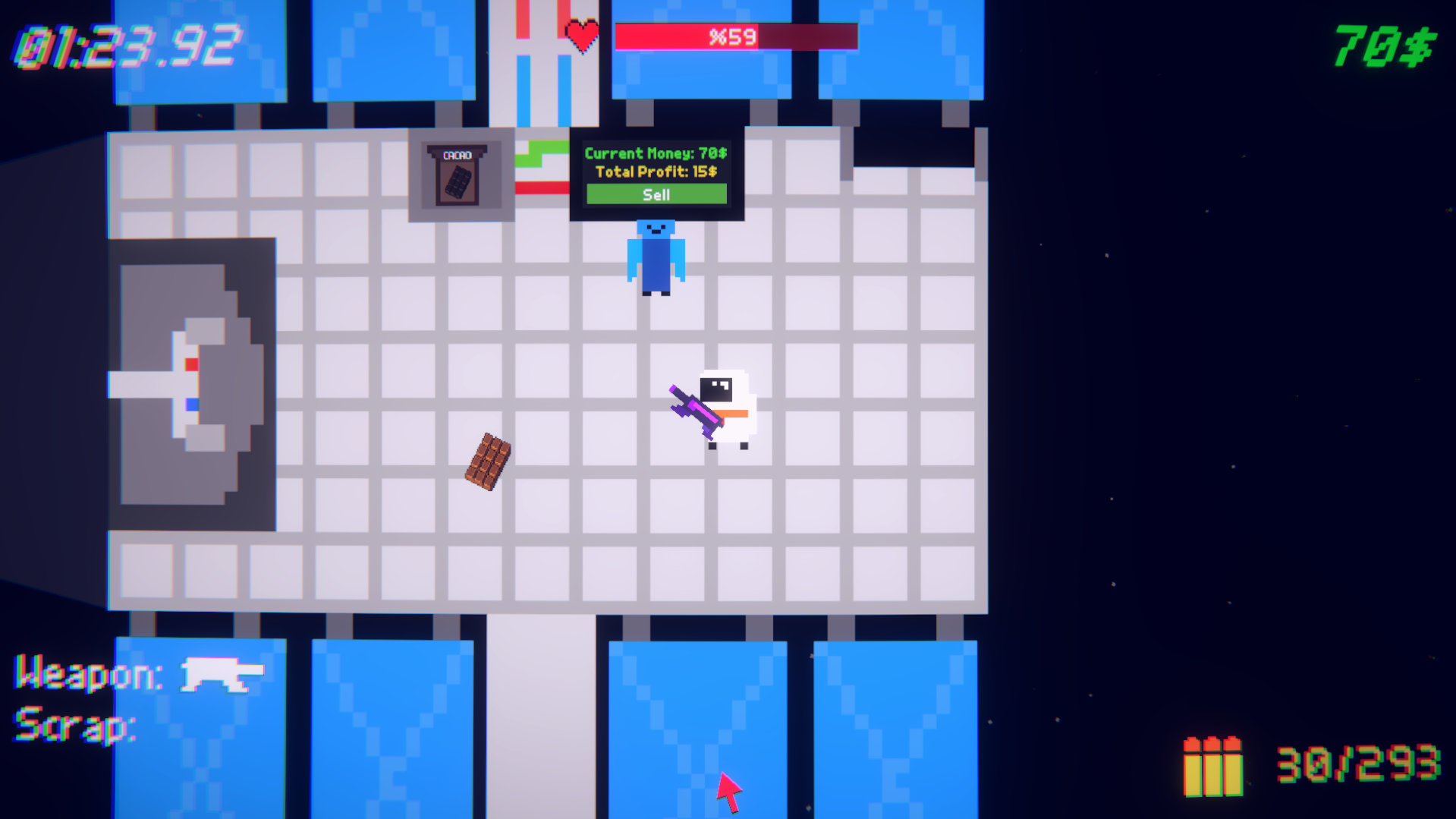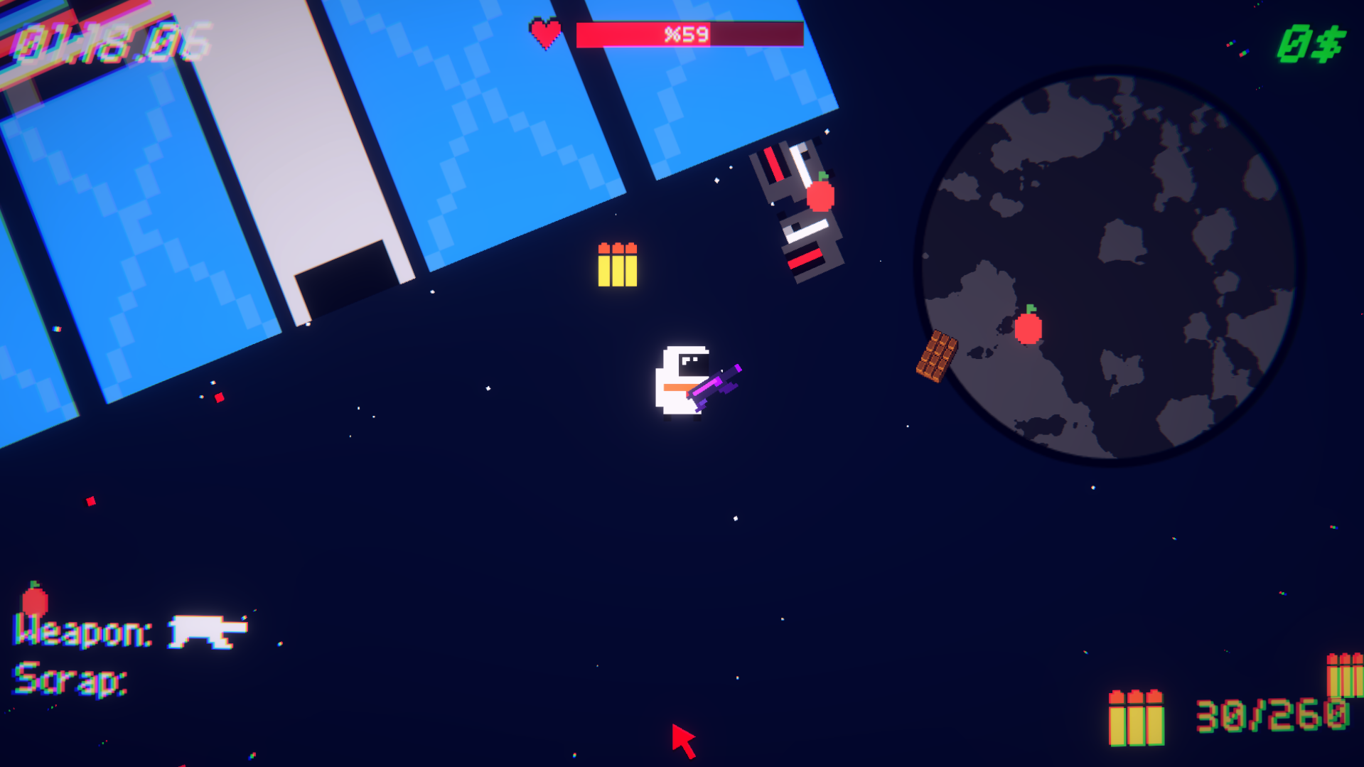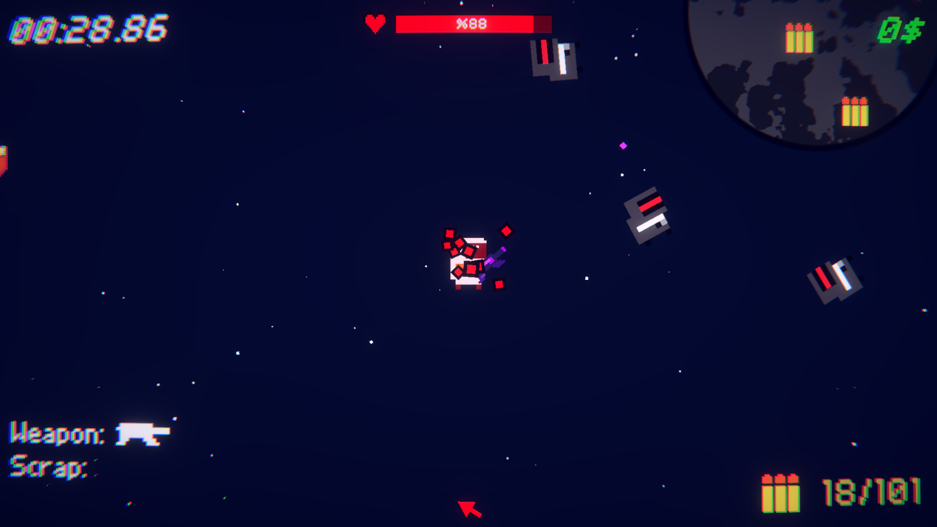 Space Scraps is a speedrunning game where you try to earn 1000$ fast as possible. You need to collect loot and scrap to earn money by selling them. But its not that easy. Different Planets and Enemies will attack you. Dodge Them And Kill Them or Explode the planets! Exploding planets and killing enemies will give you more and more loot. Try to get new highscores!
